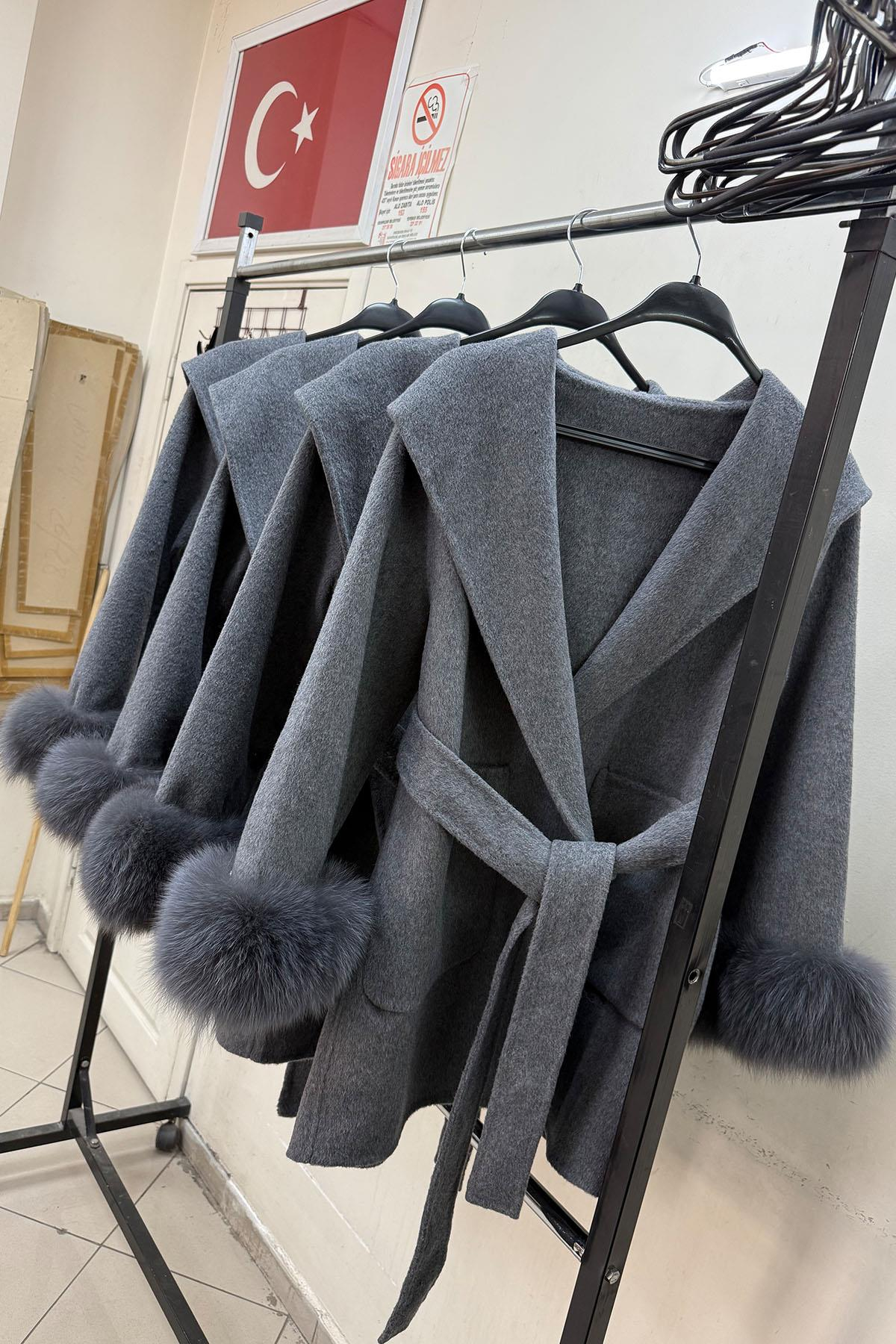 Gri Kapüşonlu ve Kolları Kürklü Panço