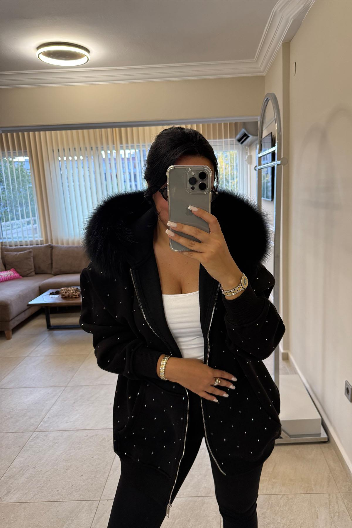 3 iplik, iç şardonu polar. Şapkası kendinden astarlı, premium kalite taşlı ve kürk detaylı sweat.