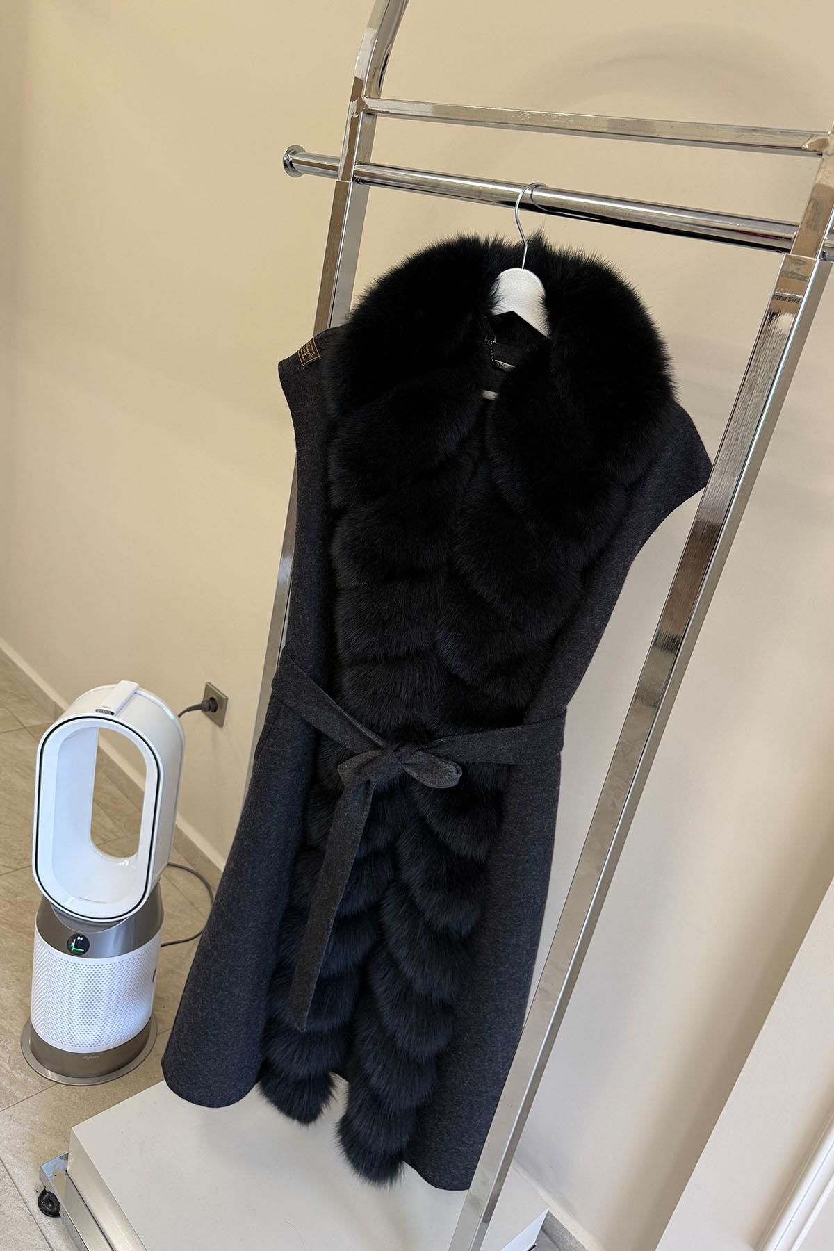 Siyah V Kesim Kürklü Maksi Boy Yelek